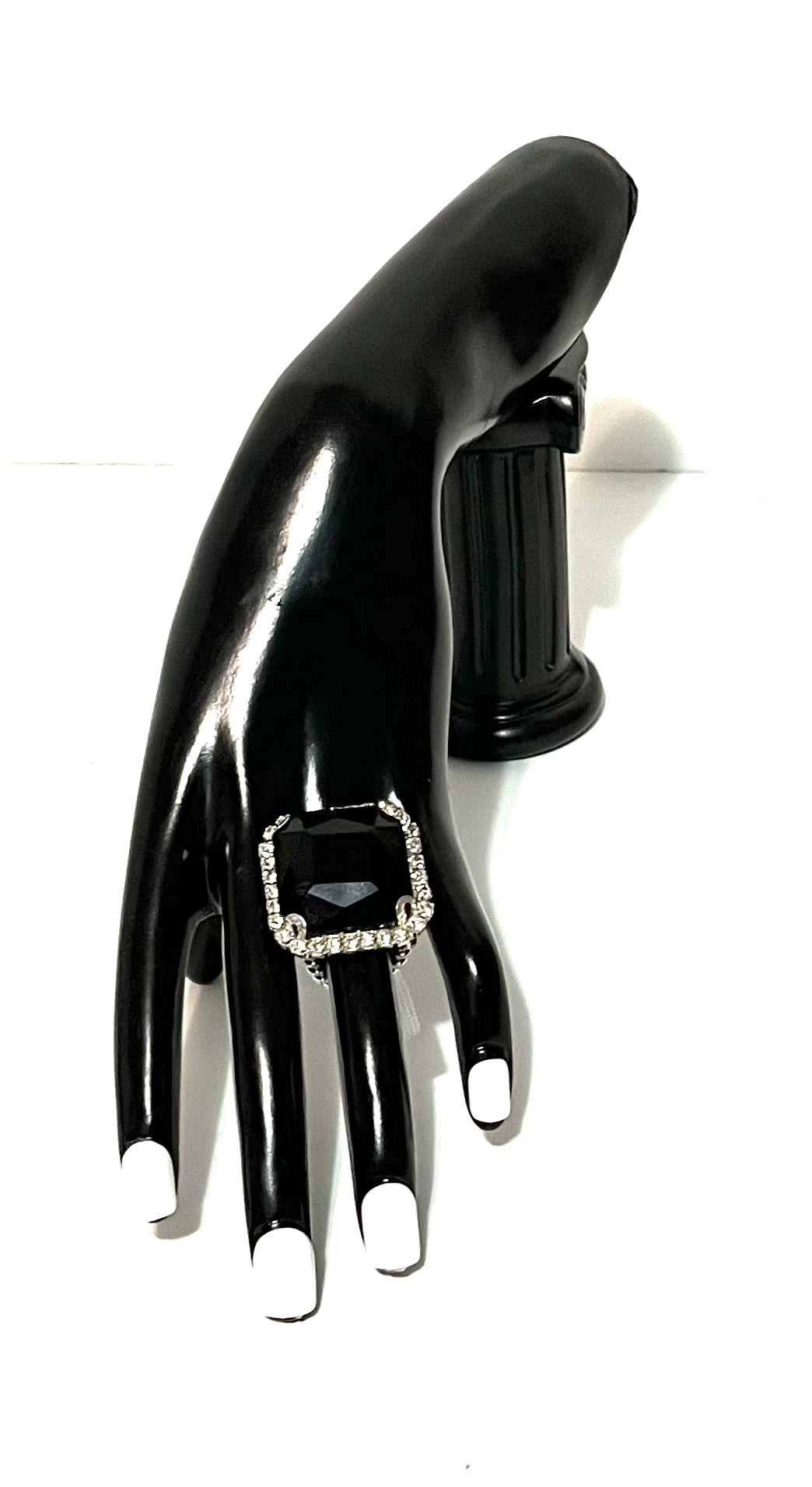 Designer inspired handmade black square ring with rhinestones. Fits 6-8 ring size.